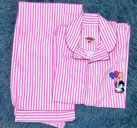Introducing our CUTE BEAR Night Suit Set — a dreamy blend of charm and comfort! Set against a soft pink base with delicate white stripes. The true highlight? A beautifully embroidered Cute bear on the pocket, framed with colourful balloons that add a coquette touch. It’s sweet, stylish, and perfect for cosy evenings filled with love.